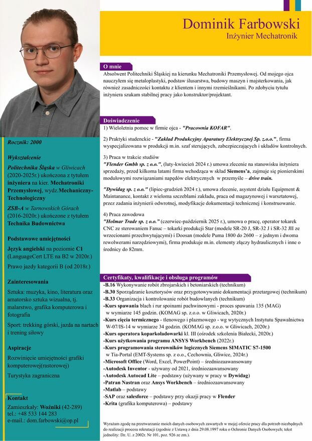 Świeżo po studiach szukam stałej pracy w inżynierii, preferuję stanowiska konstruktora i pokrewne, ale jestem otwarty na inne stanowiska i nie boję się pracy (utrzymanie ruchu czy operator maszyn/linii produkcyjnych).Jestem mobilny (auto), szukam pracy w zasięgu do 45km od Woźnik
